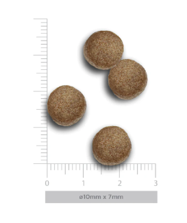 Composición: Elaborado con pavo deshidratado 15,3%, pollo deshuesado preparado en fresco 12%, guisantes verdes enteros, arroz extrusionado, hígado de pavo preparado en fresco, arroz integral 8,5%, cebada integral 8%, aceite de pollo (protegida con tocoferoles naturales) 6,6%, pato deshidratado 4%, pavo deshuesado preparado en fresco 4%, avena integral 3,4%, pollo deshidratado 2%, hígado de pollo hidrolizado 1,6%, hígado de pavo hidrolizado 1,6%, semillas de lino (fuente natural de ácidos grasos ω3) 0,5%, pulpa de remolacha, fibra de manzana, aceite de pescado (protegido con tocoferoles naturales) 0,5%, levaduras (Saccharomyces cerevisiae), minerales, brócoli fresco 1000 mg/kg, calabaza fresca 1000 mg/kg, manzanas frescas 1000 mg/kg, zanahorias frescas 1000 mg/kg, glucosamina 1000 mg/kg, condroitina 600 mg/kg, pared celular hidrolizada de levaduras (fuente de MOS) 500 mg/kg, achicoria (fuente de FOS) 400 mg/kg, extracto de mandarina 400 mg/kg, Yucca schidigera 200 mg/kg, alga kelp 30 mg/kg, arándanos rojos enteros 30 mg/kg, rosa canina (rica en vitamina C) 30 mg/kg, té verde 30 mg/kg, cúrcuma 30 mg/kg.