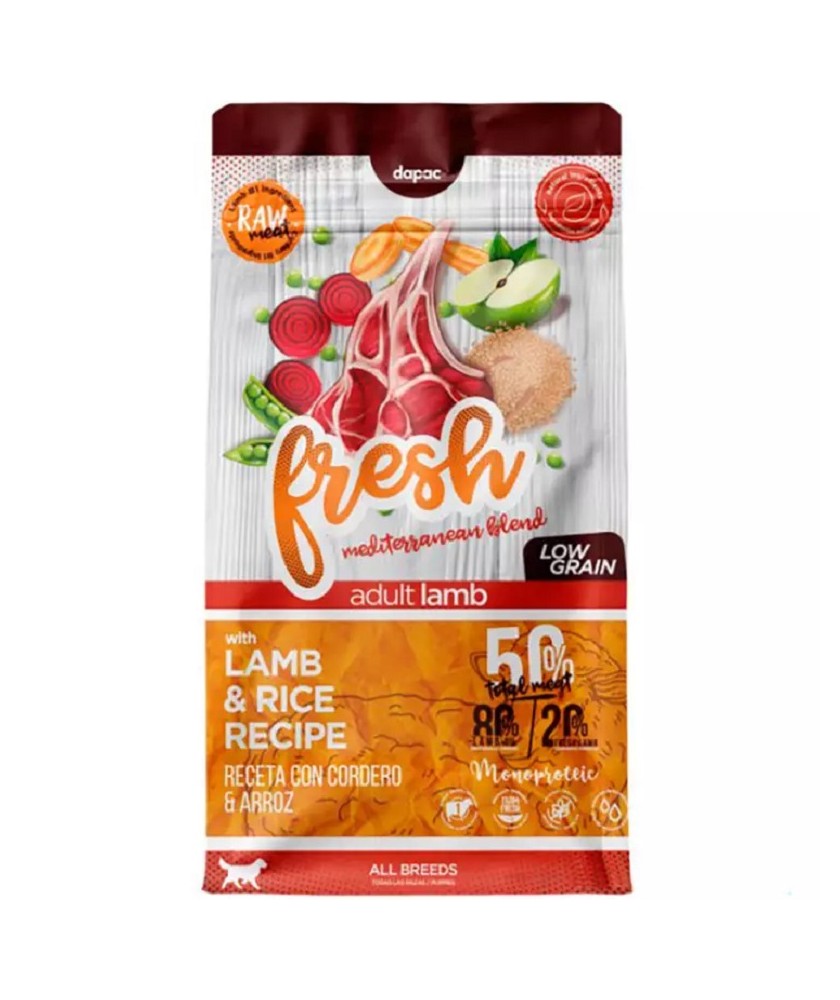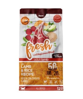 Receta low grain con cordero fresco y deshidratado, rica en proteínas animales, Omega 3 y 6, favorece digestión, piel sana y masa muscular en perros adultos.