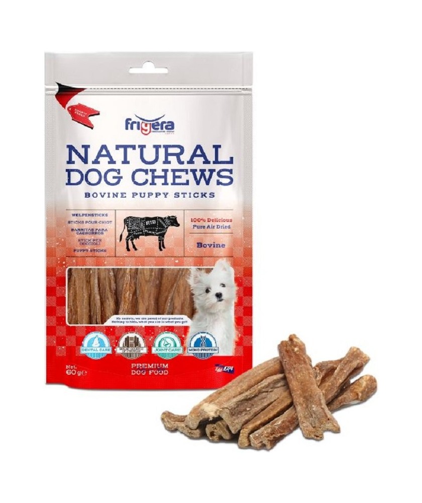 Deliciosos y saludables masticables Premium, especialmente destinados a cachorros, compuestos de vacuno 100% natural, y secados al aire.